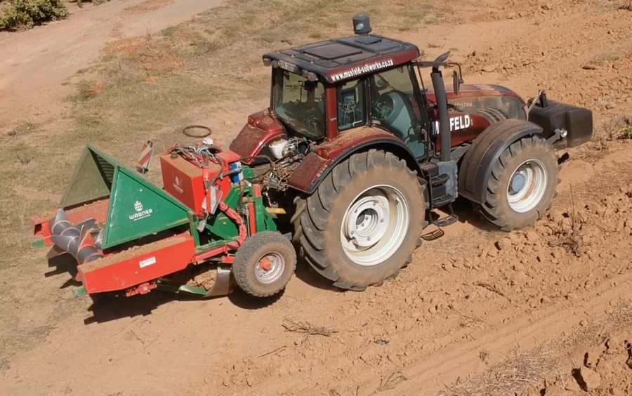 By changing the sprockets we can realise a planting distance of between 0.65-1.5 m. The biggest advantage of mechanical planting is the elimination of human error, such as inconsistent planting by hand. Since the machine plants every vine exactly the same, a more uniform growth is achieved. (J.L. van Zyl and J.E. Hoffmann, 2019. Soil Preparation for sustainable wine and table grape vineyards, Winetech, South Africa.)